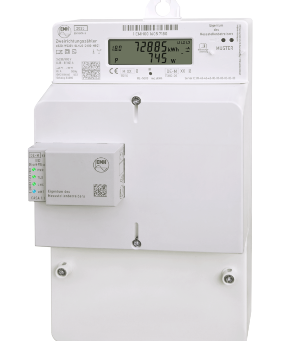 Einbau eines intelligenten Messsystems, bestehend aus einem digitalen Stromzähler, hier der eHZ-P von EMH metering, sowie einer Kommunikationseinheit, dem Smart MeterGateway, hier das CASA von EMH metering.